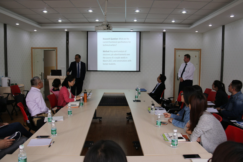 首先由曹新宇副院长致欢迎辞。美国佐治亚州立大学顾宝桐教授和Pullman教授分享了题为“A Technical Writer’s Technical Specifications”的报告,基于一百多份招聘启事对技术传播人员的要求,分析了技术传播人员的企业需求,从而从高校培养的角度总结了TC写员的培养规格。上海迪臣的范雷老师的报告名为“Technical Writer Competence Models”。基于Acrolinx公司的调查数据和Linkedin的数据,解释说明了技术传播写员的能力要求模式和信息架构工作流。张建农老师是一位资深的技术传播师,拥有几十年的从业经验。张老师以“TW Competence and Development”为题,介绍了华为公司在过去几十年的市场推广与产品说明上进行的技术传播培训经验,为高校日后培养相关人才提供了借鉴。东南大学的郭庆主任向与会专家介绍了东南大学MTI与德国Tekom合作办学的经验和课程构建情况。报告之后,与会专家和同学们就相关话题进行了热烈的讨论,曹新宇副院长就技术传播写员应具备的能力、如何成为一位优秀的技术传播写员以及人才培养过程相应的要求进行了总结。