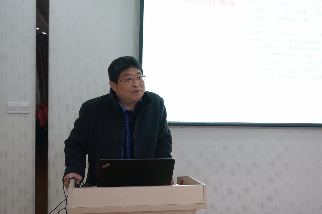 讲座伊始,董晓波教授以南京海上丝绸之路遗迹相关法律法规翻译为例,强调了了解相关历史及法律法规背景知识的重要性。随后,董晓波教授以《南京市海上丝绸之路史迹保护办法》翻译为例,为大家分析政府令、目的条款、适用条款和解释性条款等的翻译,并介绍了法律法规翻译的基本方法与策略。