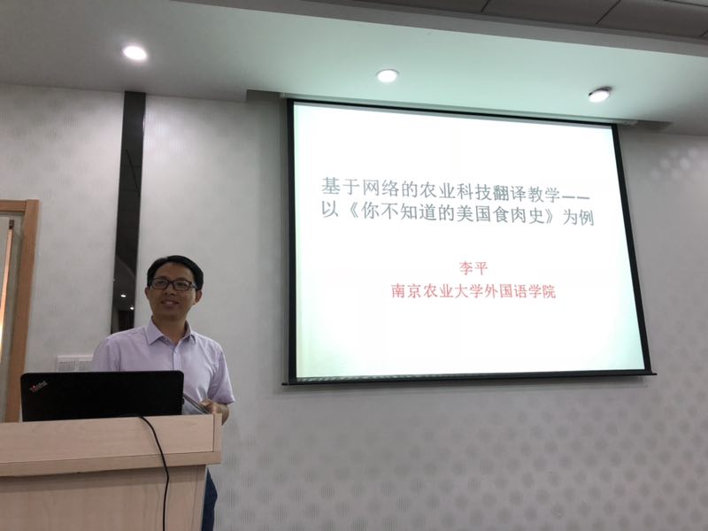 东南大学郭庆教授做了题为“翻译技术与译员核心能力框架体系研究”的主旨报告。他结合本校MTI翻译技术课程与MTI学生能力培养的经验,阐释了翻译技术相关的几个核心问题,特别是师资、经费、标准、规划等问题。南京农业大学李平教授的主旨报告题为“基于网络的农业科技翻译教学——以《你不知道的美国食肉史》为例”。他介绍了以本科生为教学对象的农业科技书籍翻译的教学经验,就《你不知道的美国食肉史》一书翻译过程中“Farmer’s Market”的术语翻译实例进行了详细探讨。他提出基于网络的翻译可以在质和量两方面提高科技翻译的概念正确性与翻译的总体效率。