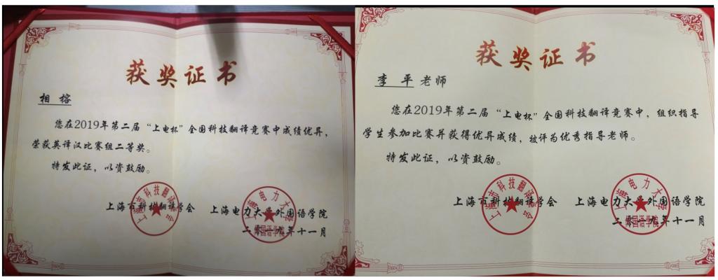 博士生导师、上海市科技翻译学会理事长何刚强教授在总结本次大赛时对此予以高度评价,称我校为此次全国科技翻译大赛中唯一的一所学校有选手同时获得了二等奖和三等奖。