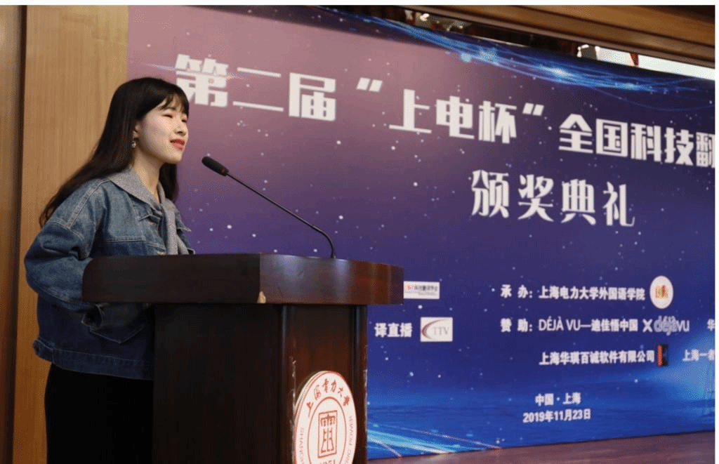 相榕同学是本届全国科技翻译竞赛二等奖及以上奖项中仅有的一位在校本科生,其余的均为研究生和职业翻译,为此她被组委会选为本科生代表登台发表获奖感言。