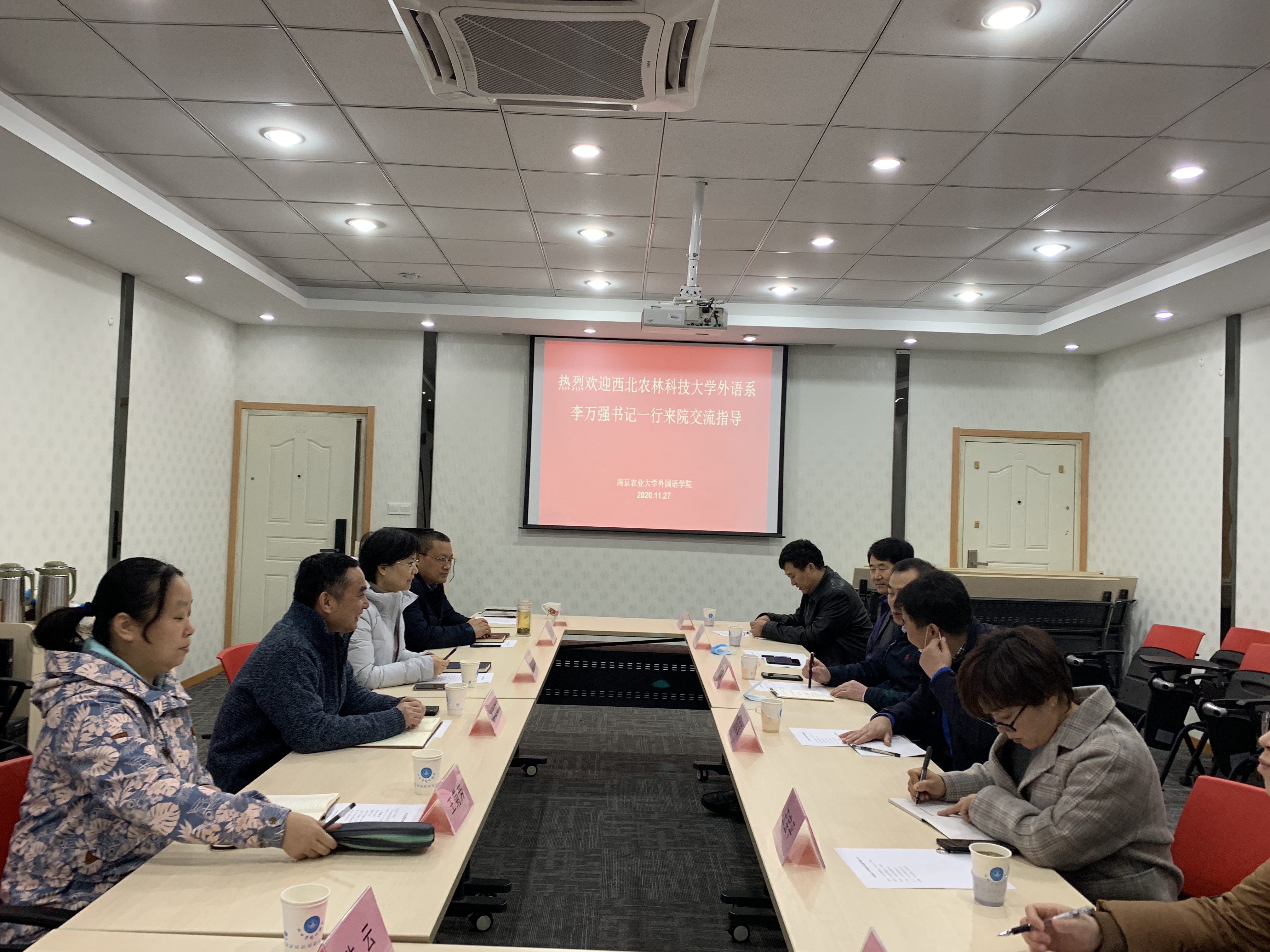 11月27日,西北农林科技大学外语系党委书记李万强、副主任殷延军、MTI教育中心负责人田志强、大学英语第一教研室主任王宝平、研究生公共外语教研室主任顾荣、党政综合办公室主任黄海斌一行6人来成人电影-av动漫-黄色电影