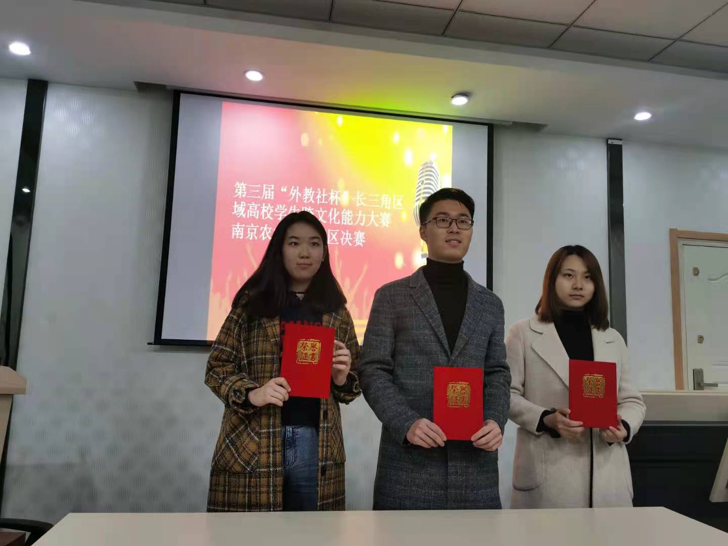 2020年11月22日晚上,第三届“外教社杯”跨文化能力大赛南京农业大学赛区决赛于教学楼A310举行。本次大赛共有12名选手进入决赛,经过激烈角逐,陶冶、孔苏扬、解欣然三名同学获得一等奖,将代表我校参加第三届“外教社杯”长三角区域高校学生跨文化能力大赛。