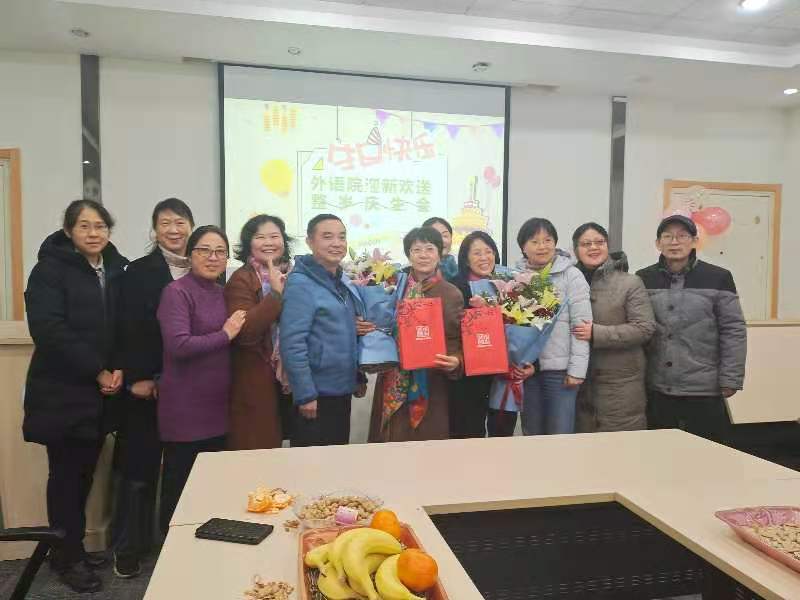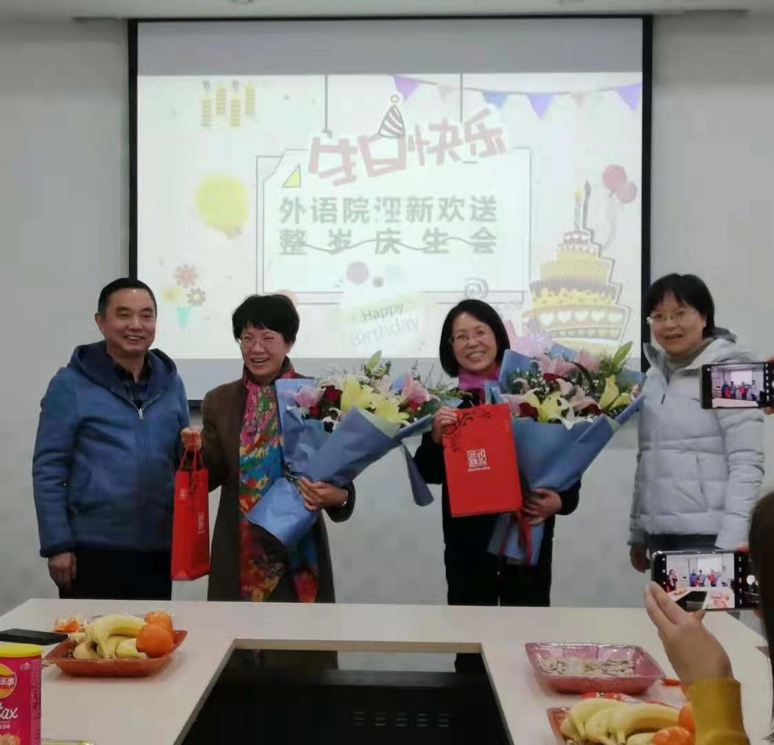 为两位荣休教师精心制作的电子相册,共忆一起度过的美好时光,部分老师还用歌声表达了对各位老师的祝福,郭凡的《祝寿歌》高亢隽永、王歆的《友谊地久天长》情意绵长;金锦珠的《金达莱花》热情奔放、邓丽霞的《樱花》情深意切,大家同唱生日歌,品尝甜美蛋糕,深情诠释着外语一家亲。