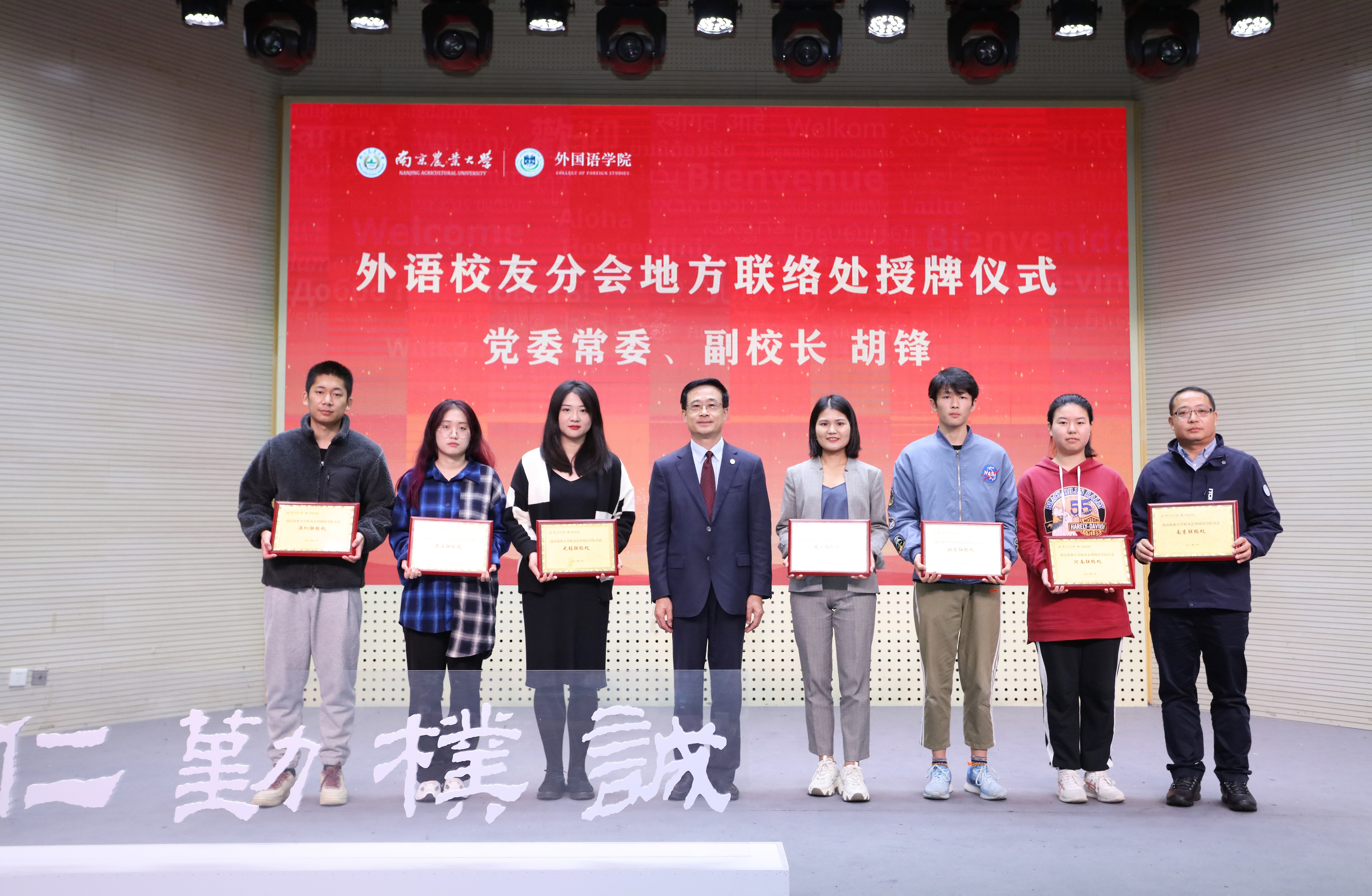 学校校友总会办公室副主任狄传华宣读了设立外语校友分会地方联络处的通知。胡锋副校长为南京、上海、深圳等7地校友联络处秘书长授牌。外语校友分会南京联络处秘书长、1997级日语专业丁安松校友代表首批校友联络处做了发言,他表示一定加强地方联络处的建设,把他建成校友与母校沟通交流,校友间互促发展的重要平台。