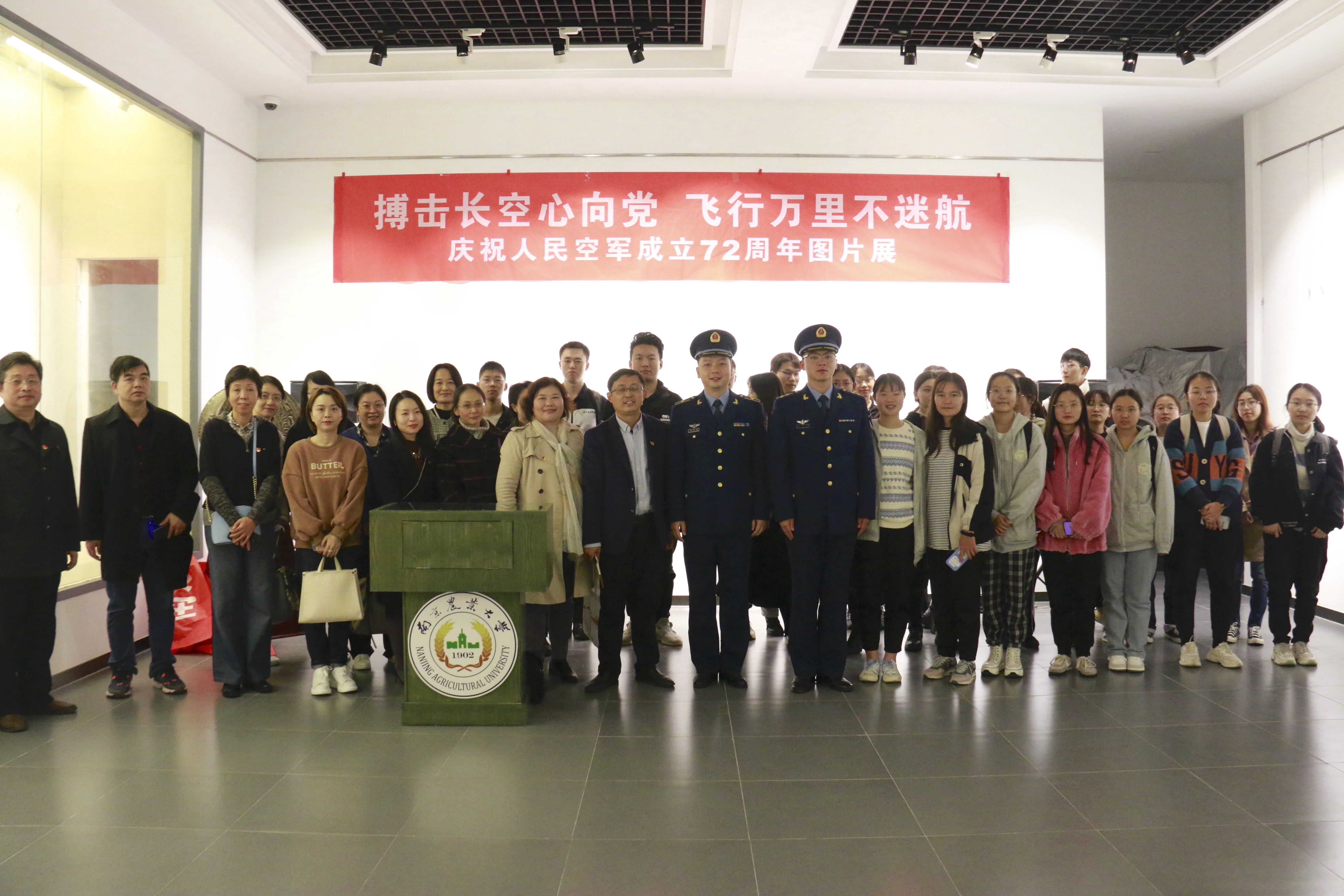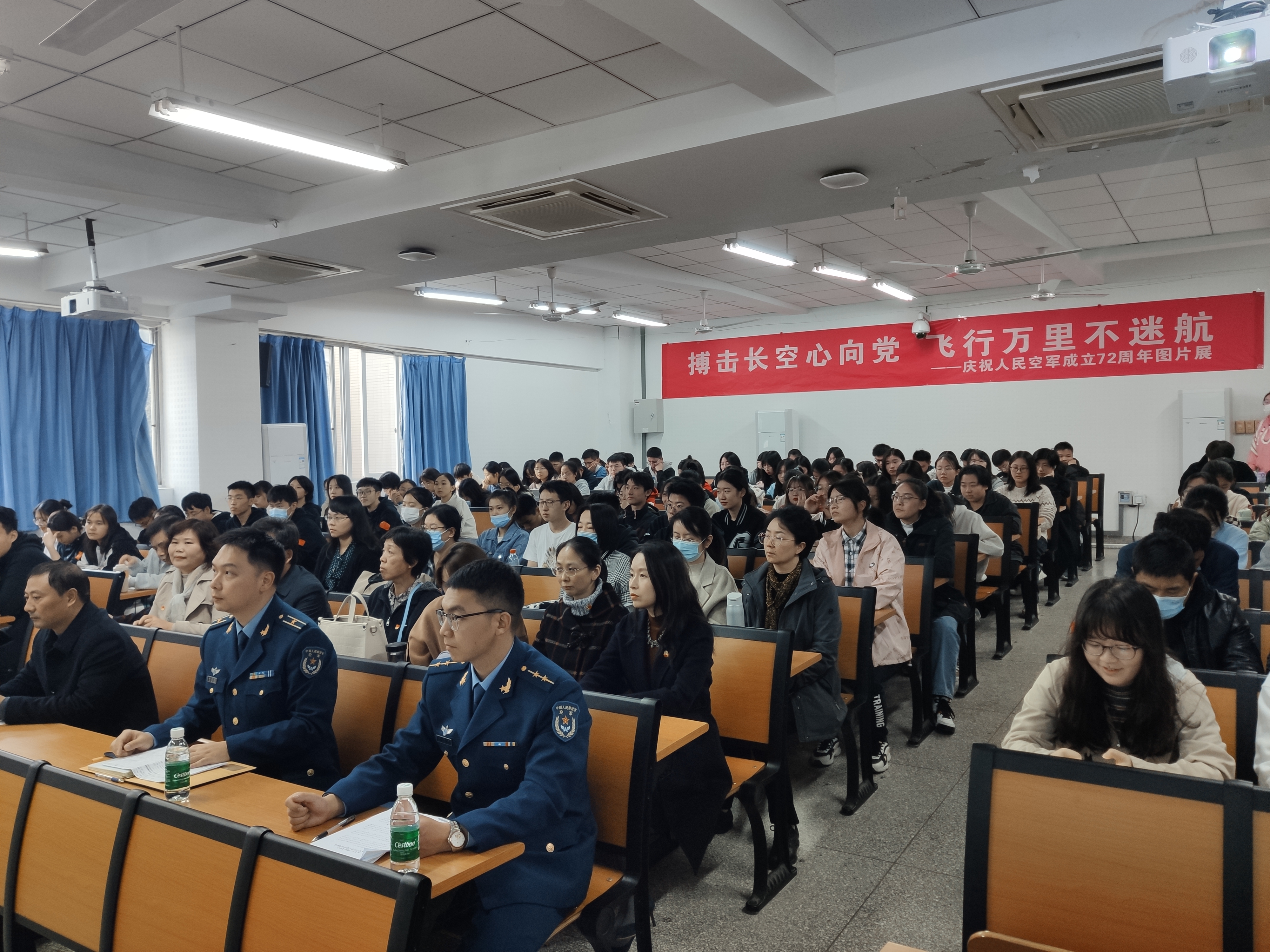 主办的《搏击长空心向党,飞行万里不迷航》—庆祝人民空军成立72周年专题报告会和图片展在卫岗校区举行。来自党委宣传部、校保卫处、成人电影
