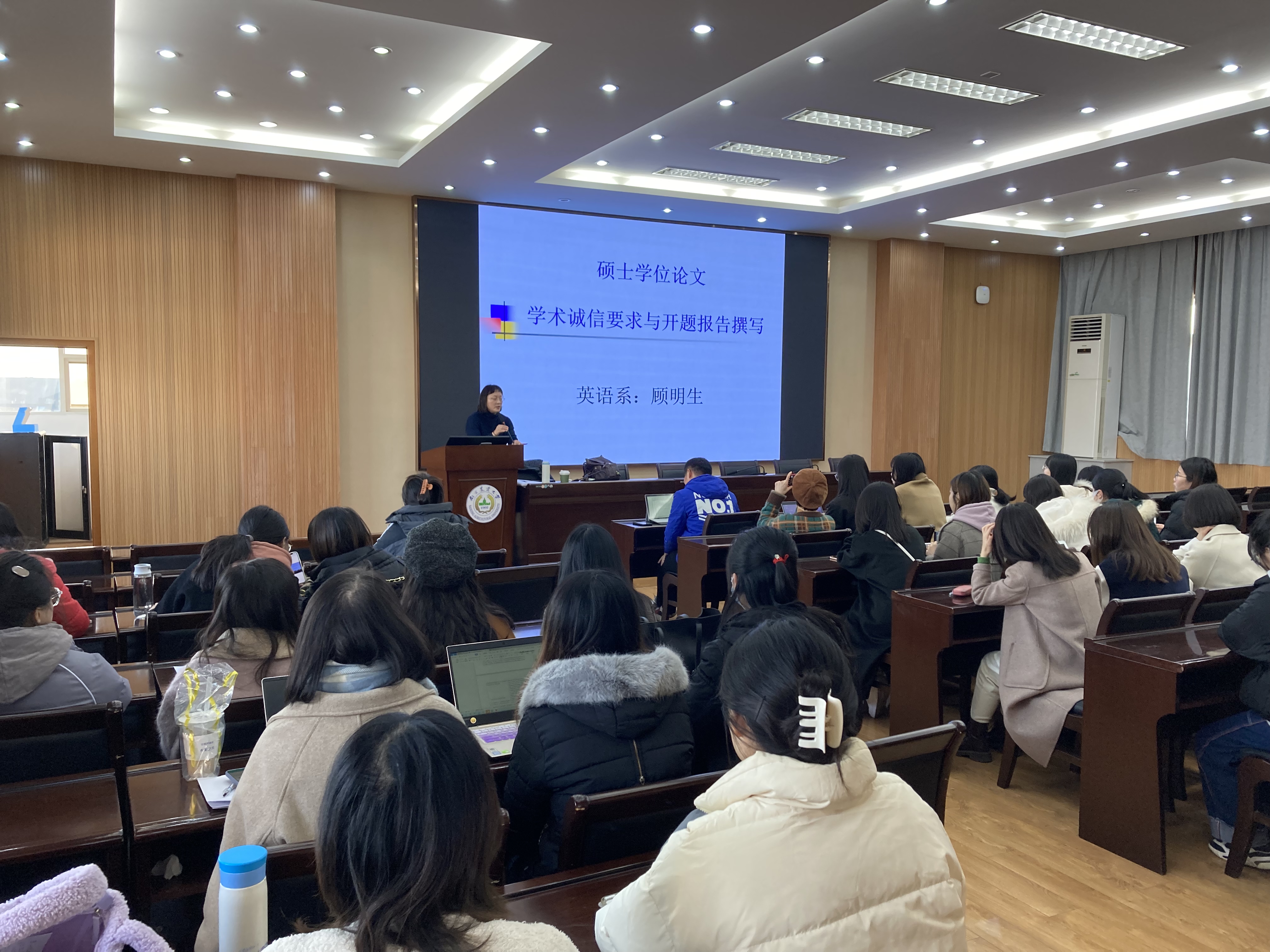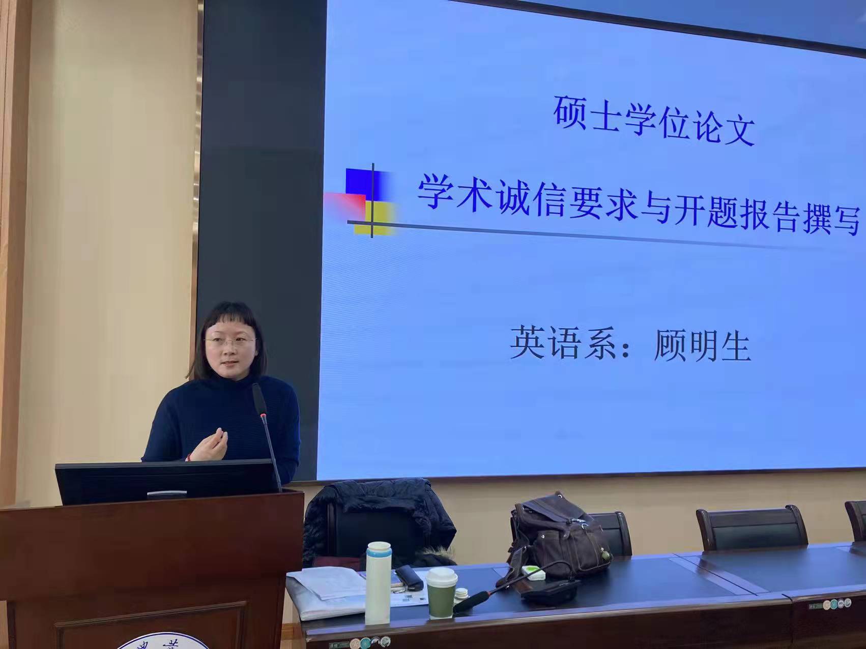 顾明生副教授应邀在教学楼七楼报告厅为全院英语语言文学方向的研究生作了一场题为“学术诚信要求与开题报告撰写”的辅导讲座。