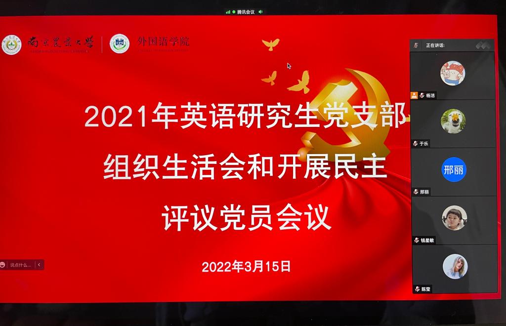 英语研究生党支部举行了线上2021年度组织生活会,并开展了民主评议党员活动。院党委副书记韩立新和英语研究生党支部全体党员一同参加了会议,会议由党支部书记杨洁主持。