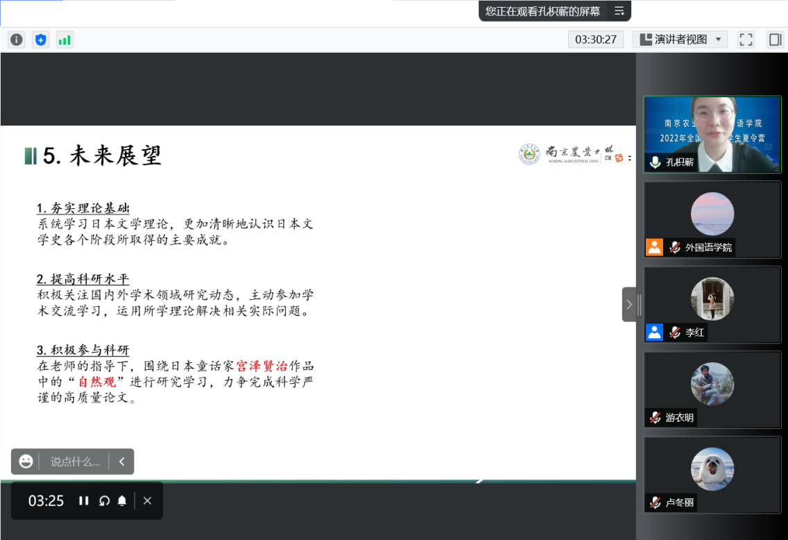 提供学习交流平台表达了感谢。裴正薇在本次夏令营活动总结致辞中肯定了各位营员的综合实力,向所有营员表示祝贺,并激励大家始终保持团结友爱、求知进取、奋发有为的精神风貌。最后,她向各位同学发出邀请,欢迎大家选择美丽的南农校园深造学习。夏令营闭营仪式由副院长游衣明主持。