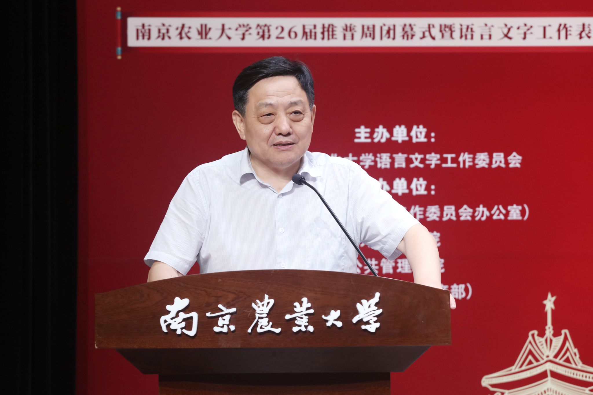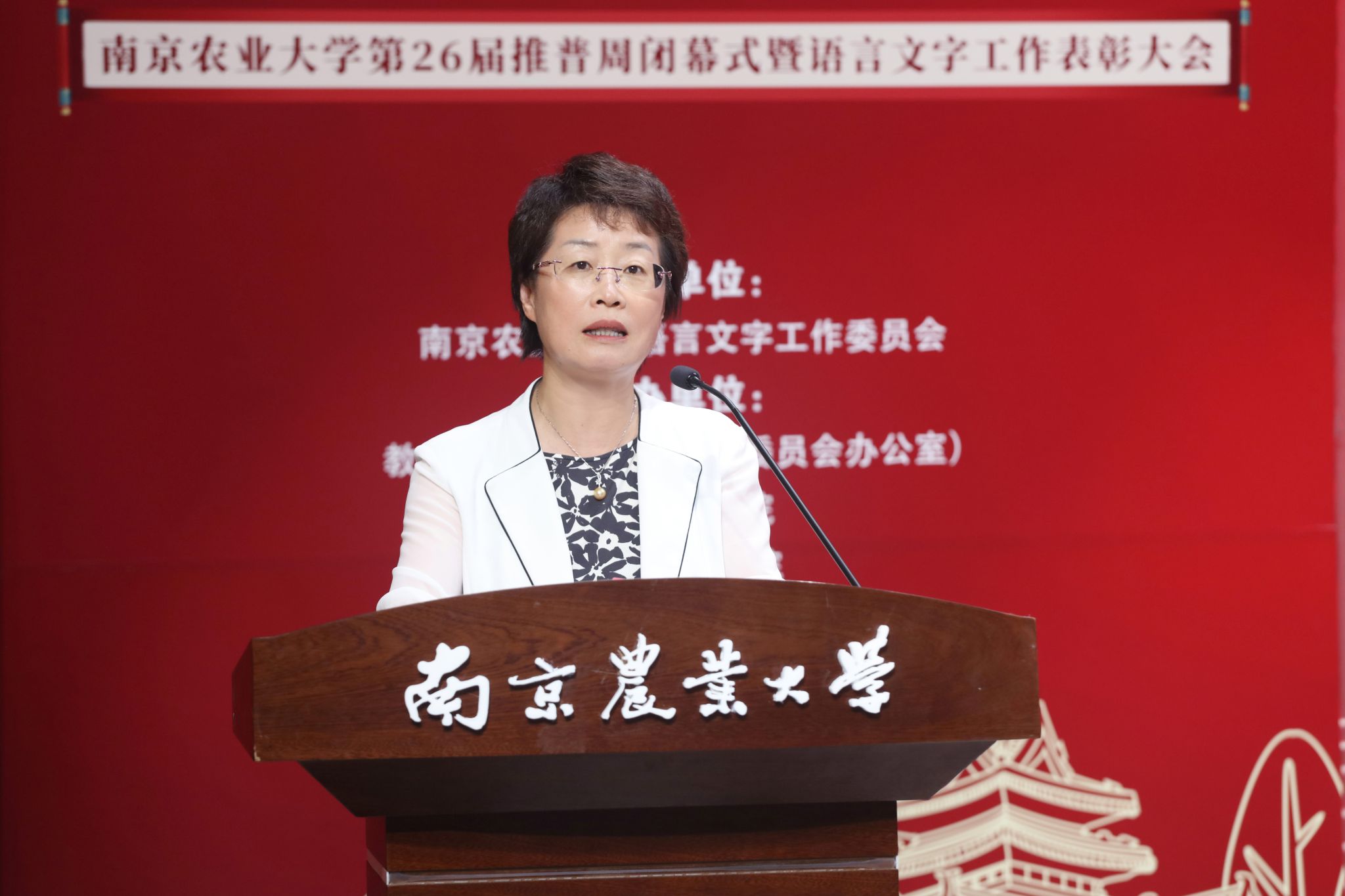 朱艳在致辞中指出,我校长期以来积极发挥特色优势,集聚各类资源,坚定不移地推广普及国家通用语言文字。自第26届全国推普周活动启动以来。我校创新性地联合南京大学、东南大学、南京理工大学成立“推普联盟”,举办高水平推普讲座、诵读比赛、文字创意大赛路展等丰富多彩的活动,在校园内营造了浓厚的推普、学普氛围,促进了学校语言文字工作走深、走实,形成了广泛的社会影响。她强调,推普工作任重道远,一是应当加快促进校内组织与校际联盟相融合,构筑校内外一体化语言工作格局;二是促进第一课堂与第二课堂融合,将语言文字工作作为立德树人的重要抓手,将其贯穿人才培养全过程;三是把文化育人与服务国家战略相融合,充分发挥学校的农业优势和特色,主动对接乡村振兴、农业农村现代化等国家战略,彰显南农的使命担当。