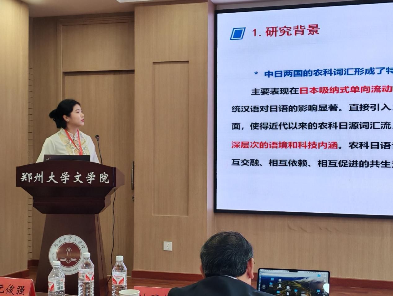 郑冠景小组进行了“中日农科词汇互文关照下‘汉语型化’式语言建构研究”主题汇报。从课题研究背景出发,讲述了中日农科词汇的译介与受容已成为学界备受关注的热点话题,并指出中日两国的农科词汇已经形成了特色鲜明的互文现象,通过研究“汉语型化”式构词法,使中日农科汉语词汇得到了更大程度的丰富与扩充,为科技语言的建构发展打下了厚实的基础。