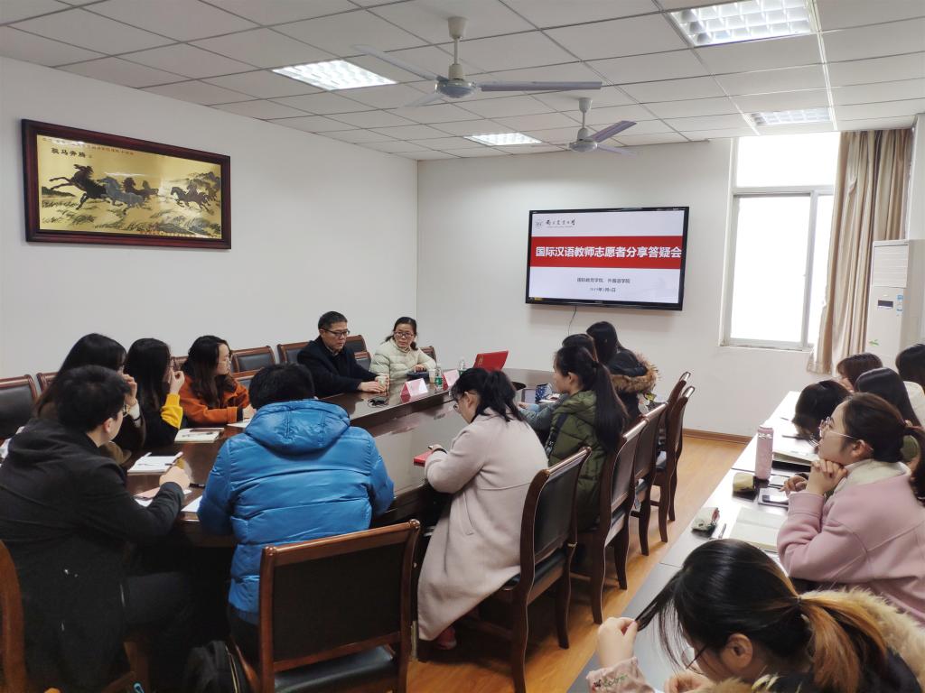 在我校的相关事务。她就我校国际汉语教师志愿者的申请选聘、面试推荐、培训等方面为同学们进行了详细的介绍,重点分享了志愿者在面试过程中的注意事项,为同学们进行有准备综合测试提供了切实可行的建议。